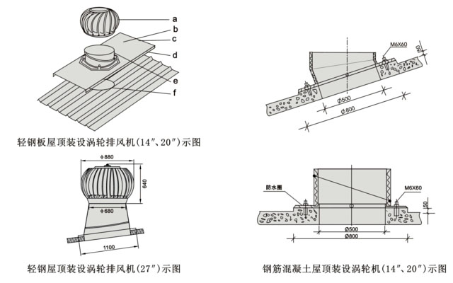 | 2、DWT-Ⅳ(无电机)屋顶涡轮排风机屋面安装示图说明 |