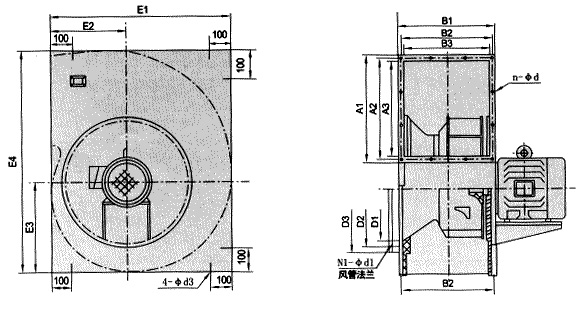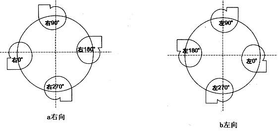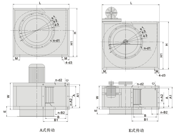 本系列风机分A式直联传动和E式皮带传动,按叶轮旋转方向分为左旋和右旋,旋转方向从电机或皮带轮侧看为准,以出风口分为00、900、1800、2700四种出风方式,订货时需注明。